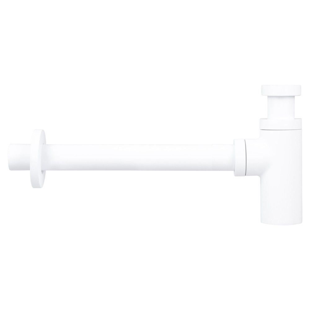 Design sifon gemaakt van messing, uitgevoerd in de kleur mat wit. De bijgeleverde muurbuis is 295 mm. en is op gewenste lengte te zagen. De hoogte van de sifon is tot 120 mm. verstelbaar.