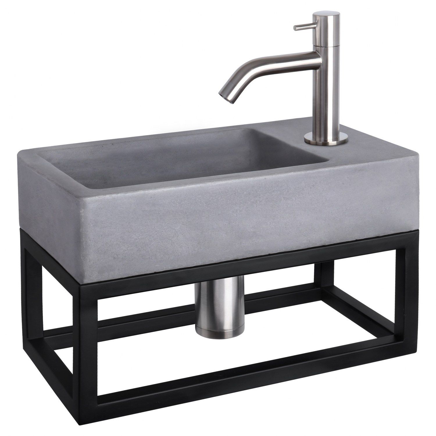 Deze combinatie bestaat uit het stijlvolle donker betonnen wasbakje Force met mat chromen gebogen koudwaterkraan, afvoerplug en sifon.Het handige bijpassende mat zwarte handdoekrek, waar u bijvoorbeeld uw handdoeken of andere toiletbenodigheden kunt plaatsen of hangen, maakt de set helemaal af. Het kraangat zit aan de rechterkant van dit stijlvolle wasbakje. Het betonnen materiaal is zeer stevig en heeft een waterdichte coating. Beton zorgt voor een industriële uitstraling en is goed te combineren met de diverse beschikbare kleuren kranen, afvoerpluggen en sifons.
