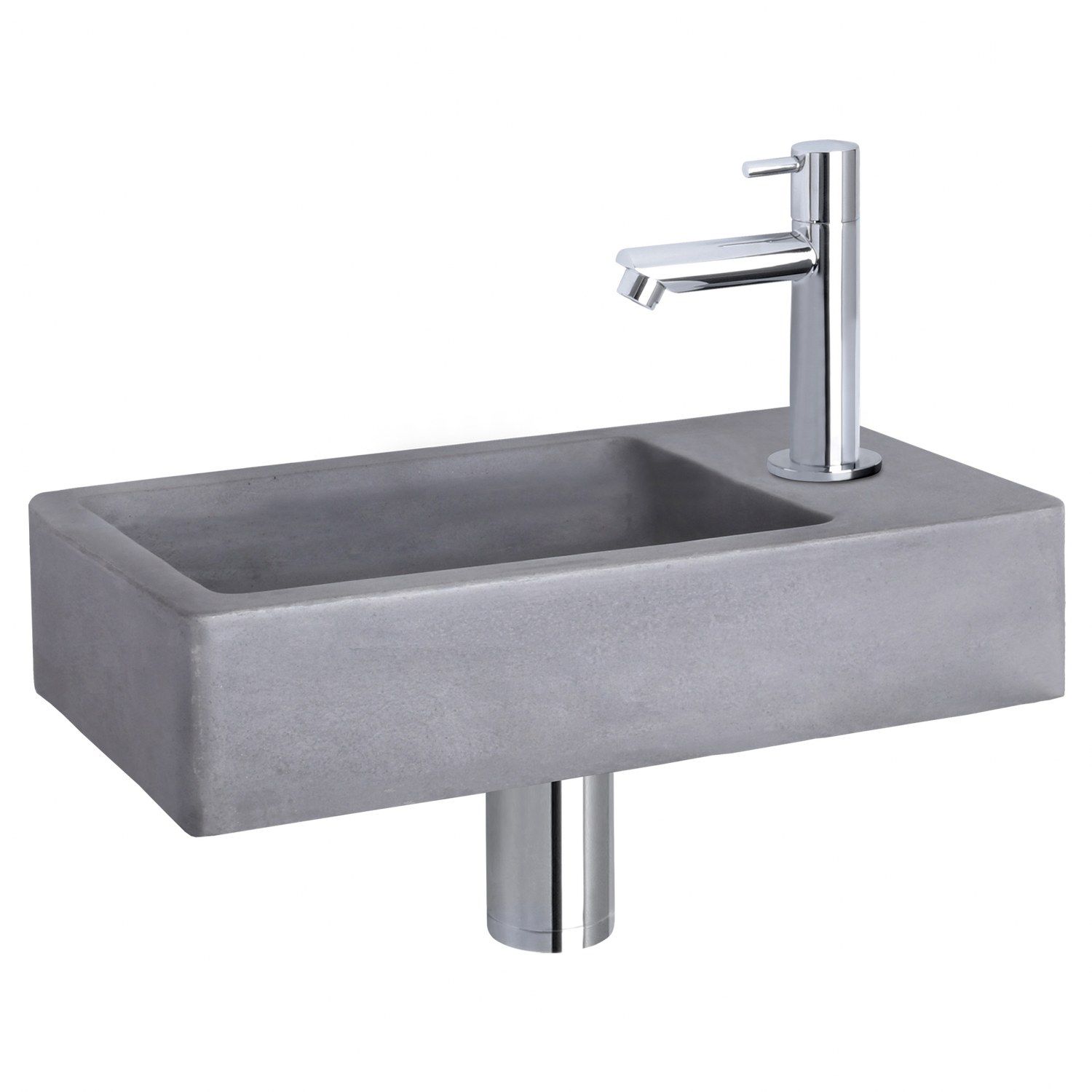 Deze combinatie bestaat uit het stijlvolle donker betonnen wasbakje Force met chromen rechte koudwaterkraan, afvoerplug en sifon. Het kraangat zit aan de rechterkant van dit stijlvolle wasbakje. Het betonnen materiaal is zeer stevig en heeft een waterdichte coating. Beton zorgt voor een industriële uitstraling en is goed te combineren met de diverse beschikbare kleuren kranen, afvoerpluggen en sifons.