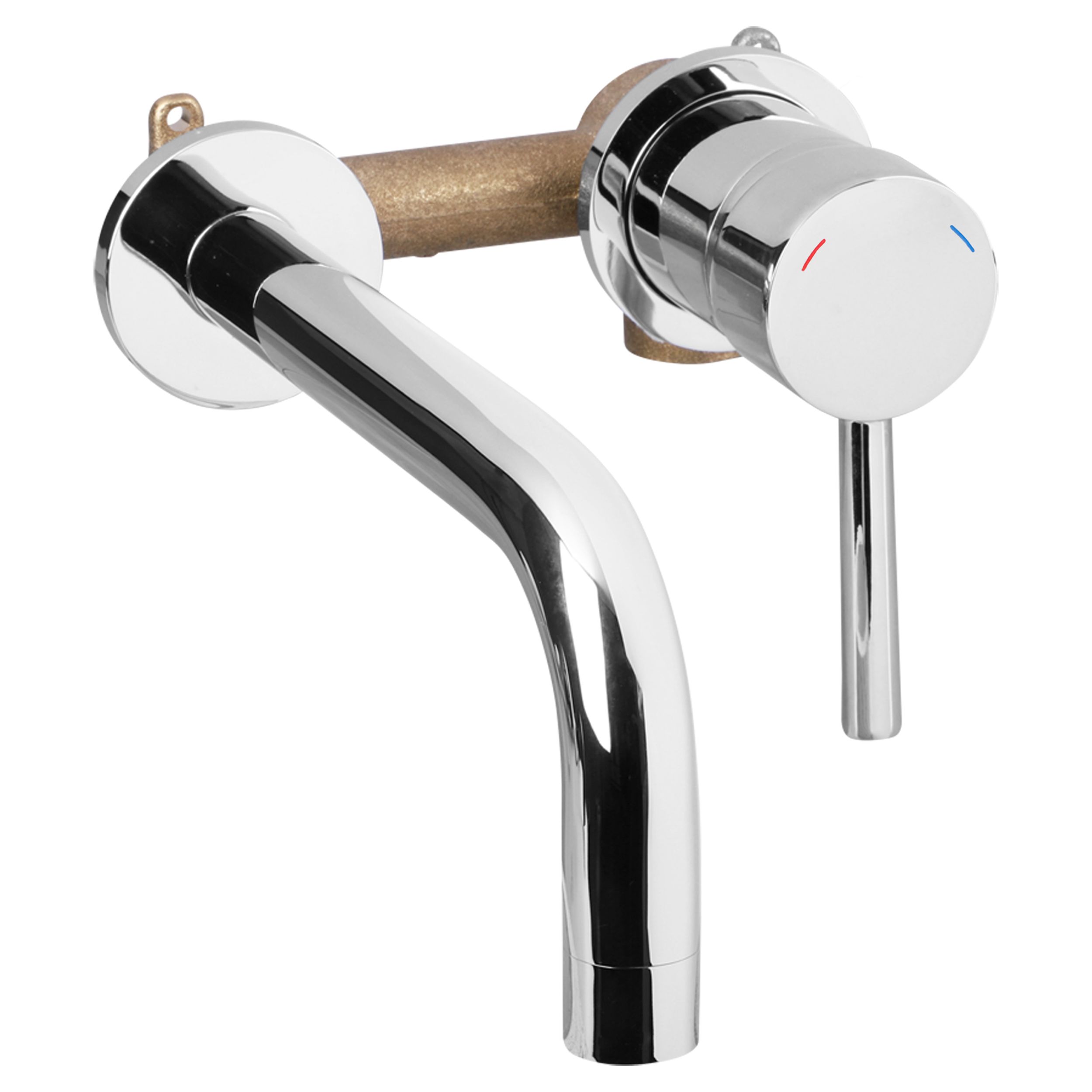 Deze chromen muurkraan wordt voor een gedeelte in de muur ingebouwd en heeft een uitloop met een lengte van 24,6 cm en een inbouwdiepte van 40-82cm. De mengfunctie zorgt er voor dat koud en heet water wordt gemengd tot de juiste temperatuur. De inbouw mengkraan is eenvoudig te bedienen met een hendel waarmee u de temperatuur van het water kunt bepalen. De kraan is uitgevoerd in messing in de kleur chroom.