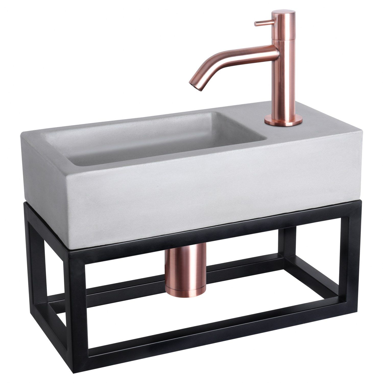 Deze combinatie bestaat uit het stijlvolle licht betonnen wasbakje Ravo met roodkoper gekleurde gebogen koudwaterkraan, afvoerplug en sifon.Het handige bijpassende mat zwarte handdoekrek, waar u bijvoorbeeld uw handdoeken of andere toiletbenodigheden kunt plaatsen of hangen, maakt de set helemaal af. Het kraangat zit aan de rechterkant van dit stijlvolle wasbakje. Het betonnen materiaal is zeer stevig en heeft een waterdichte coating. Beton zorgt voor een industriële uitstraling en is goed te combineren met de diverse beschikbare kleuren kranen, afvoerpluggen en sifons.