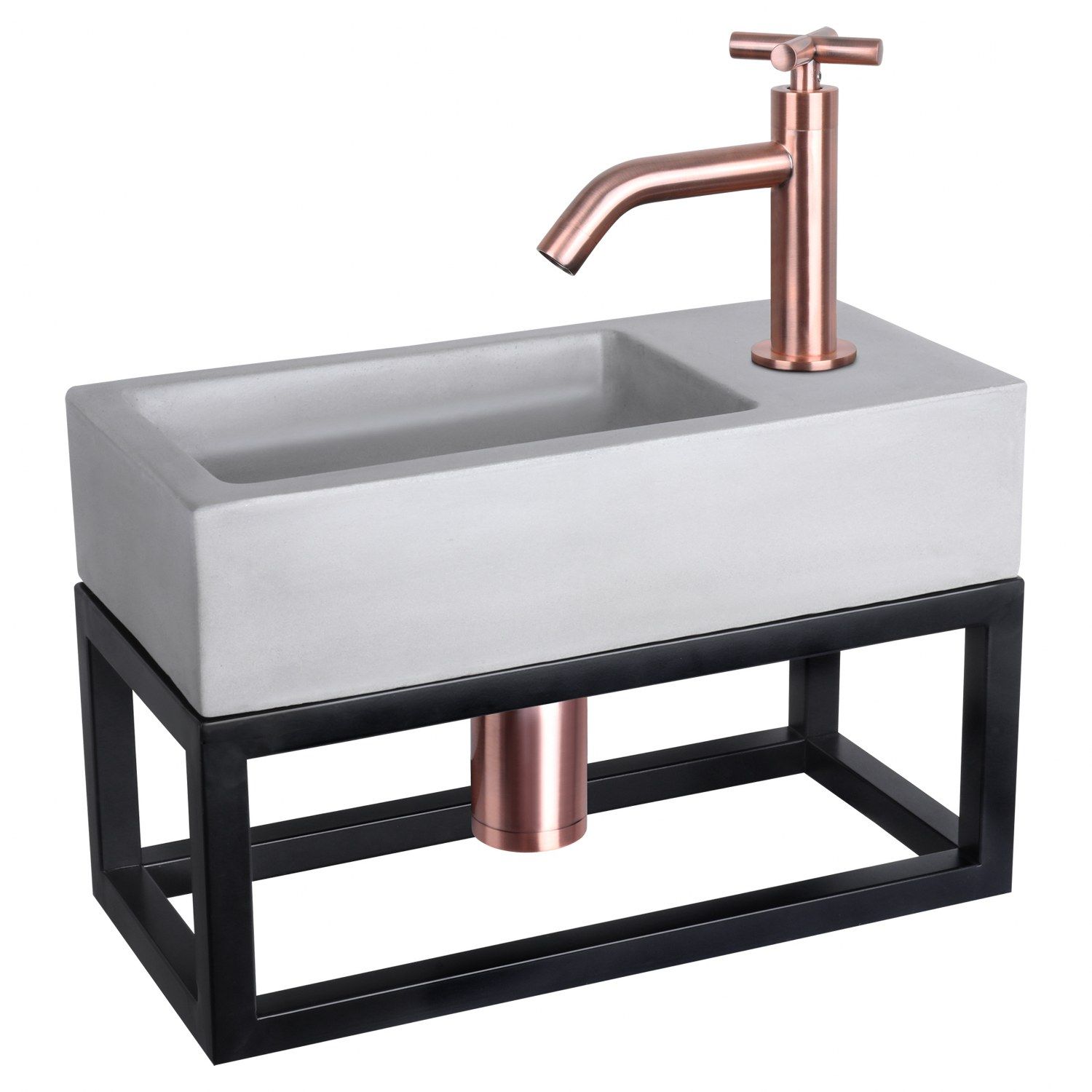 Deze combinatie bestaat uit het stijlvolle licht betonnen wasbakje Ravo met roodkoper gekleurde gebogen koudwaterkraan met kruis bediening, afvoerplug en sifon.Het handige bijpassende mat zwarte handdoekrek, waar u bijvoorbeeld uw handdoeken of andere toiletbenodigheden kunt plaatsen of hangen, maakt de set helemaal af. Het kraangat zit aan de rechterkant van dit stijlvolle wasbakje. Het betonnen materiaal is zeer stevig en heeft een waterdichte coating. Beton zorgt voor een industriële uitstraling en is goed te combineren met de diverse beschikbare kleuren kranen, afvoerpluggen en sifons.