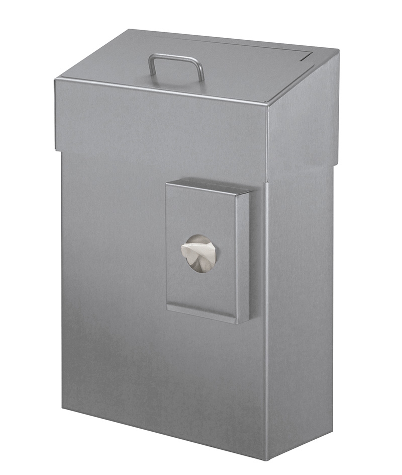 Hygiënebak met gesloten inworpklep en gemonteerde zakjeshouder. Met binnenring. Deksel is afneembaar voor het wisselen van de afvalzakken. Met RVS hendel voor het openen van de deksel. Inhoud: 10 liter.