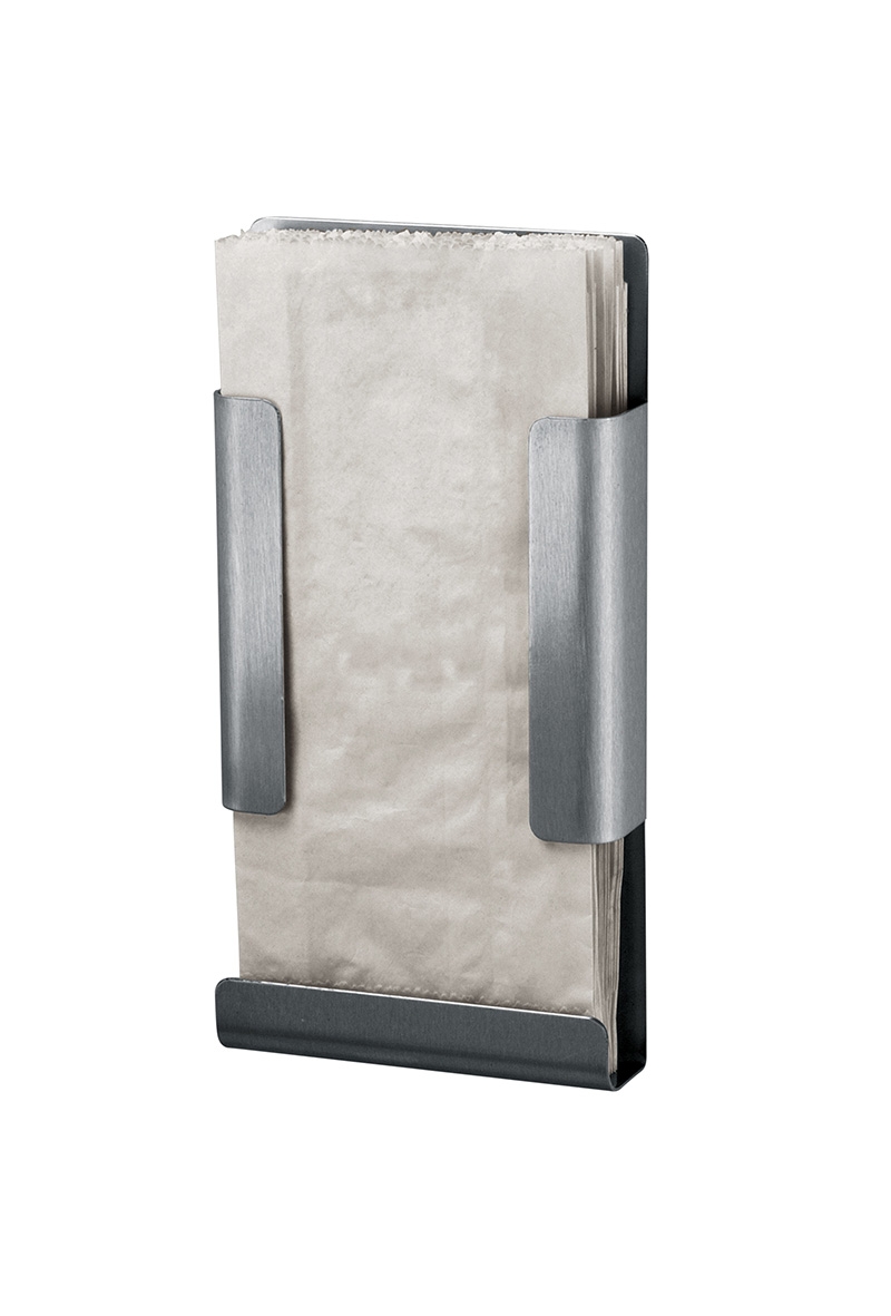 Hygiënezakjesdispenser voor papieren zakjes. Montage op een afvalbak of aan de wand. Uitname en navulling vanaf de bovenzijde. Met 2-puntsbevestiging.