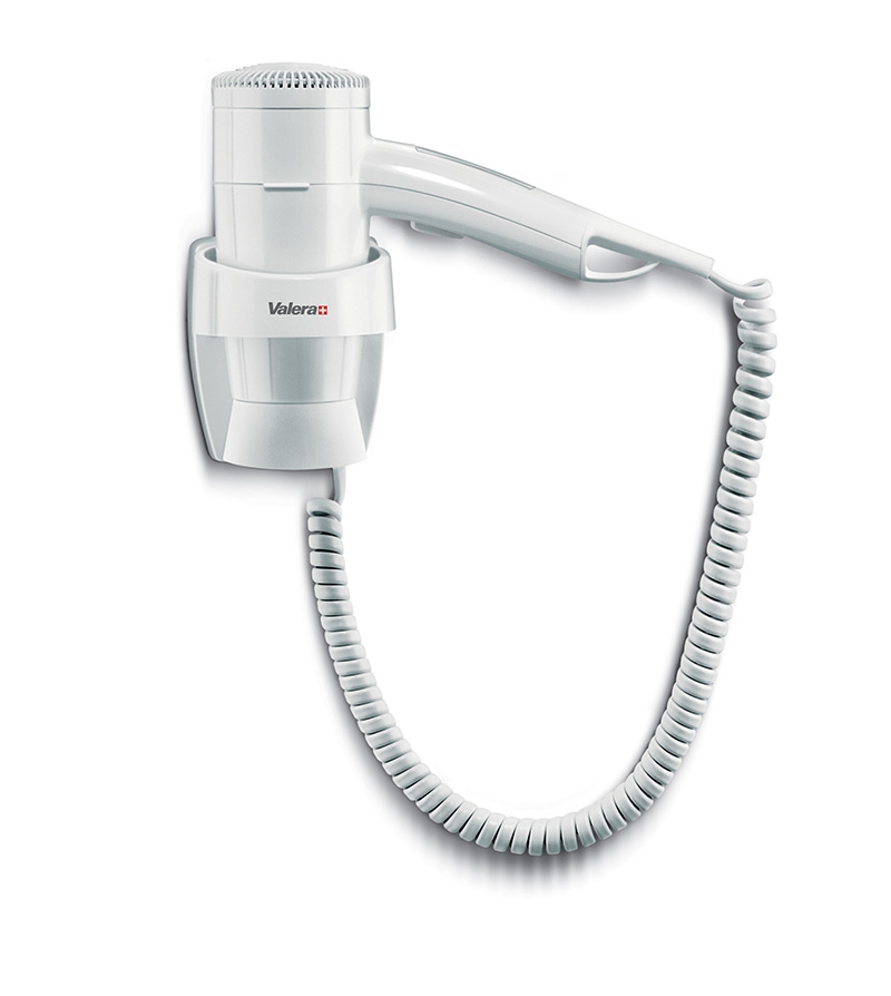 Wandhaardroger wit 1200 Watt met wit spiraalsnoer. Met 1 temperatuurstand, aan/uit drukknop en smal mondstuk. Wandhouder met: aan/uit veiligheidsschakelaar. Eco-vriendelijk model.